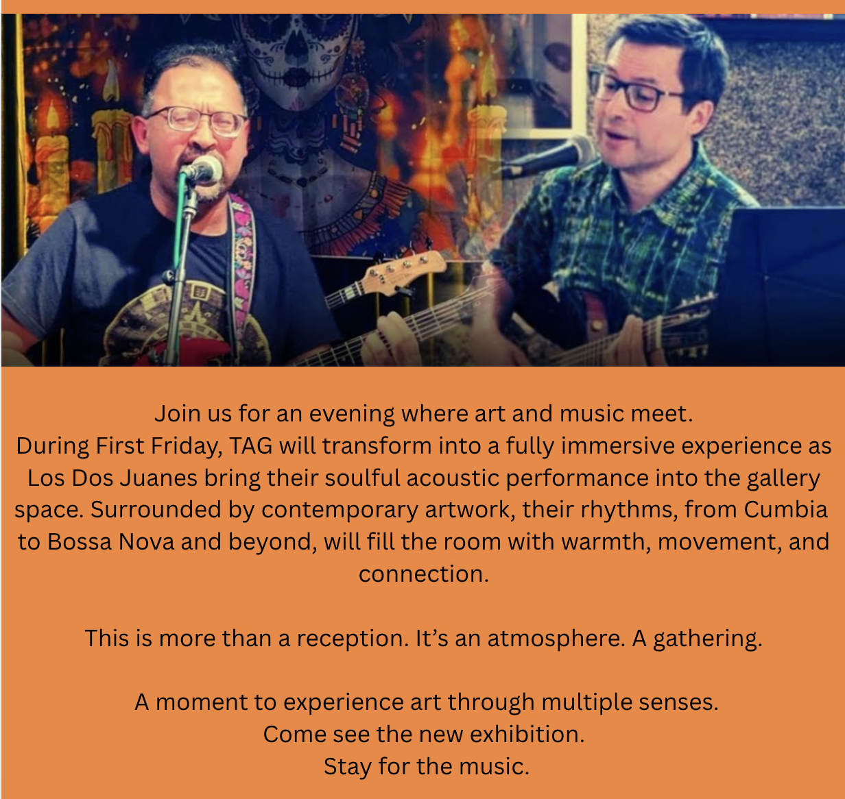 Let’s meet there on Saturday, raise a glass of wine, and enjoy the enchanting Latin rhythms as the guitars and voices of Los dos Juanes fill the gallery!